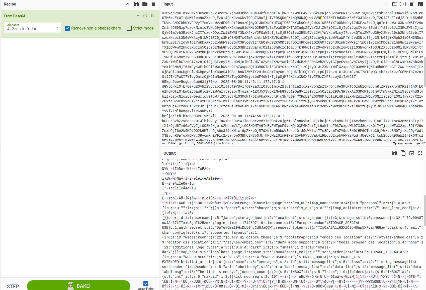 language|s:5:"en_US";imap_namespace|a:4:{s:8:"personal";a:1:{i:0;a:2:{i:0;s:0:"";i:1;s:1:"/";}}s:5:"other";N;s:6:"shared";N;s:10:"prefix_out";s:0:"";}imap_delimiter|s:1:"/";imap_list_conf|a:2:{i:0;N;i:1;a:0:{}}user_id|i:1;username|s:5:"jacob";storage_host|s:9:"localhost";storage_port|i:143;storage_ssl|b:0;password|s:32:"L7Rv00A8TuwJAr67kITxxcSgnIk25Am/";login_time|i:1749397119;timezone|s:13:"Europe/London";STORAGE_SPECIAL-USE|b:1;auth_secret|s:26:"DpYqv6maI9HxDL5GhcCd8JaQQW";request_token|s:32:"TIsOaABA1zHSXZOBpH6up5XFyayNRHaw";task|s:4:"mail";skin_config|a:7:{s:17:"supported_layouts";a:1:{i:0;s:10:"widescreen";}s:22:"jquery_ui_colors_theme";s:9:"bootstrap";s:18:"embed_css_location";s:17:"/styles/embed.css";s:19:"editor_css_location";s:17:"/styles/embed.css";s:17:"dark_mode_support";b:1;s:26:"media_browser_css_location";s:4:"none";s:21:"additional_logo_types";a:3:{i:0;s:4:"dark";i:1;s:5:"small";i:2;s:10:"small-dark";}}imap_host|s:9:"localhost";page|i:1;mbox|s:5:"INBOX";sort_col|s:0:"";sort_order|s:4:"DESC";STORAGE_THREAD|a:3:{i:0;s:10:"REFERENCES";i:1;s:4:"REFS";i:2;s:14:"ORDEREDSUBJECT";}STORAGE_QUOTA|b:0;STORAGE_LIST-EXTENDED|b:1;list_attrib|a:6:{s:4:"name";s:8:"messages";s:2:"id";s:11:"messagelist";s:5:"class";s:42:"listing messagelist sortheader fixedheader";s:15:"aria-labelledby";s:22:"aria-label-messagelist";s:9:"data-list";s:12:"message_list";s:14:"data-label-msg";s:18:"The list is empty.";}unseen_count|a:2:{s:5:"INBOX";i:2;s:5:"Trash";i:0;}folders|a:1:{s:5:"INBOX";a:2:{s:3:"cnt";i:2;s:6:"maxuid";i:3;}}list_mod_seq|s:2:"10";```so the pass is: L7Rv00A8TuwJAr67kITxxcSgnIk25Am/