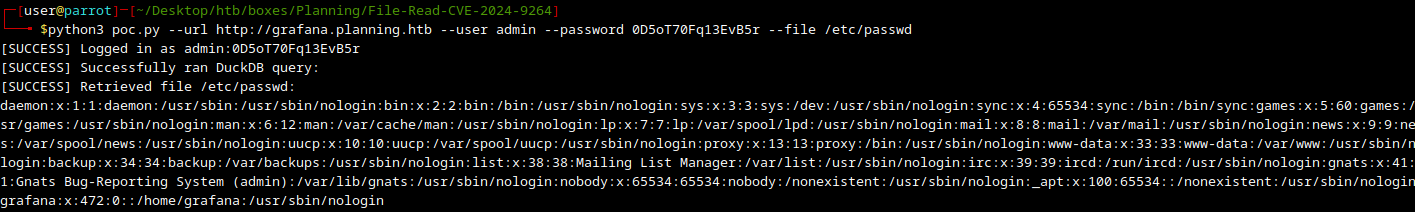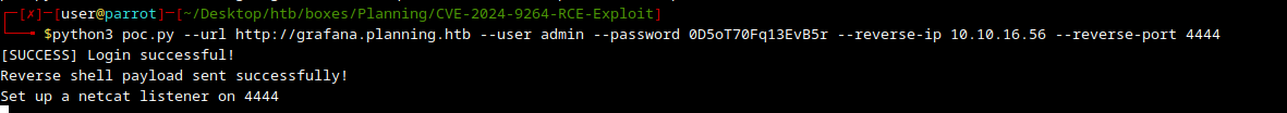 Looking online we can quickly find oficial notice about CVE-2024-9264 and a POC on github. Anotherone is already setup to establish reverse shell. It is using an authenticated user to perform a DuckDB SQL query and read an arbitrary file on the filesystem or execute arbitrary code remotely.