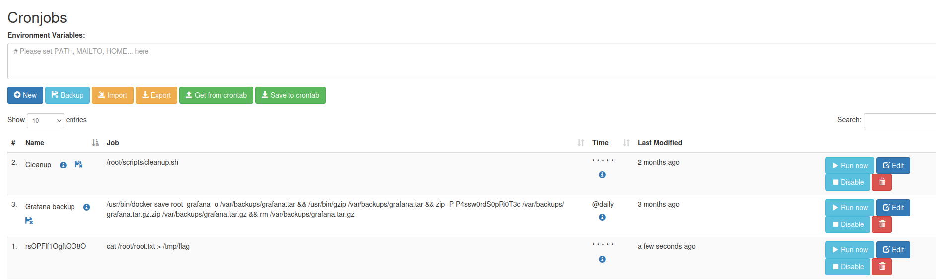 It gives us a cronjob ui panel which gives us basicly root. We can do whatever we want from now, just cat the flag or give enzo sudo.