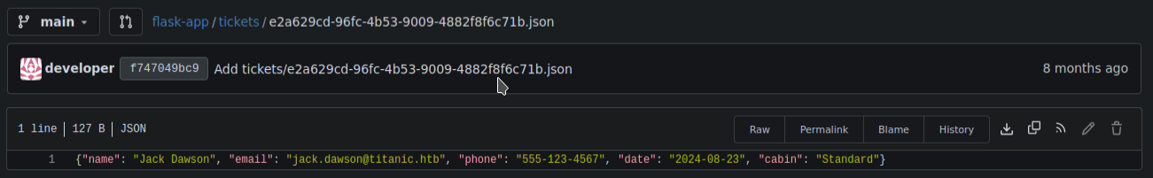 {"name": "Jack Dawson", "email": "jack.dawson@titanic.htb", "phone": "555-123-4567", "date": "2024-08-23", "cabin": "Standard"}