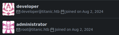 1|administrator|administrator||root@titanic.htb|0|enabled|cba20ccf927d3ad0567b68161732d3fbca098ce886bbc923b4062a3960d459c08d2dfc063b2406ac9207c980c47c5d017136|pbkdf2$50000$50|0|0|0||0|||70a5bd0c1a5d23caa49030172cdcabdc|2d149e5fbd1b20cf31db3e3c6a28fc9b|en-US||1722595379|1722597477|1722597477|0|-1|1|1|0|0|0|1|0|2e1e70639ac6b0eecbdab4a3d19e0f44|root@titanic.htb|0|1|0|0|0|0|0|0|0||gitea-auto|0