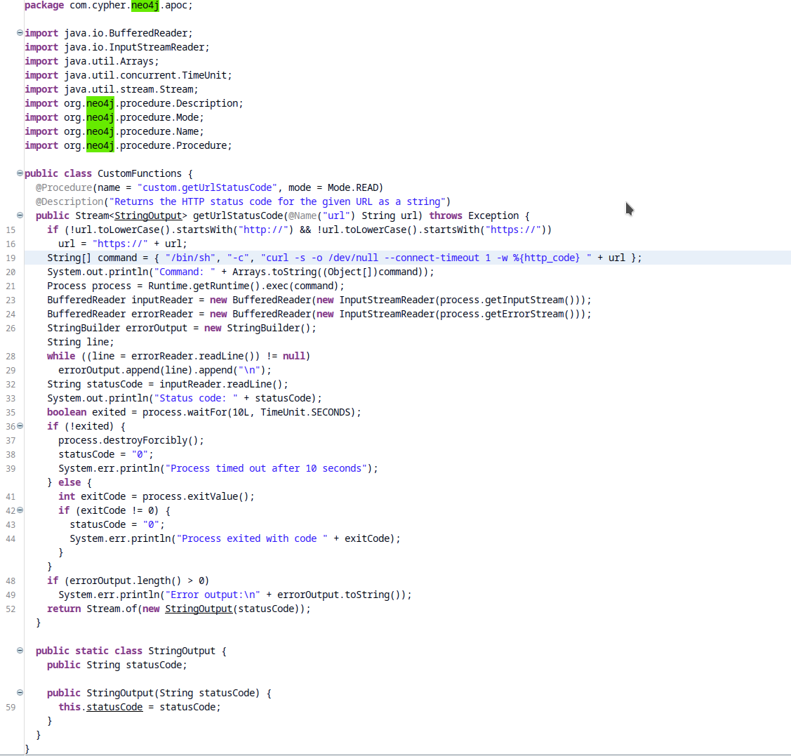 Testing it further and learning more about cypher allowed me to call the custom java function discovered ealier. (another good resource here)