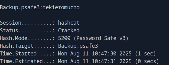 Backup.psafe3: Password Safe V3 databaseWe can crack it with hashcat and get password tekieromucho.