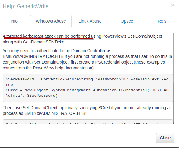 SMB 10.129.201.124 445 DC [+] administrator.htb\emily:UXLCI5iETUsIBoFVTj8yQFKoHjXmb We finally get to log in as emily and get user flag.